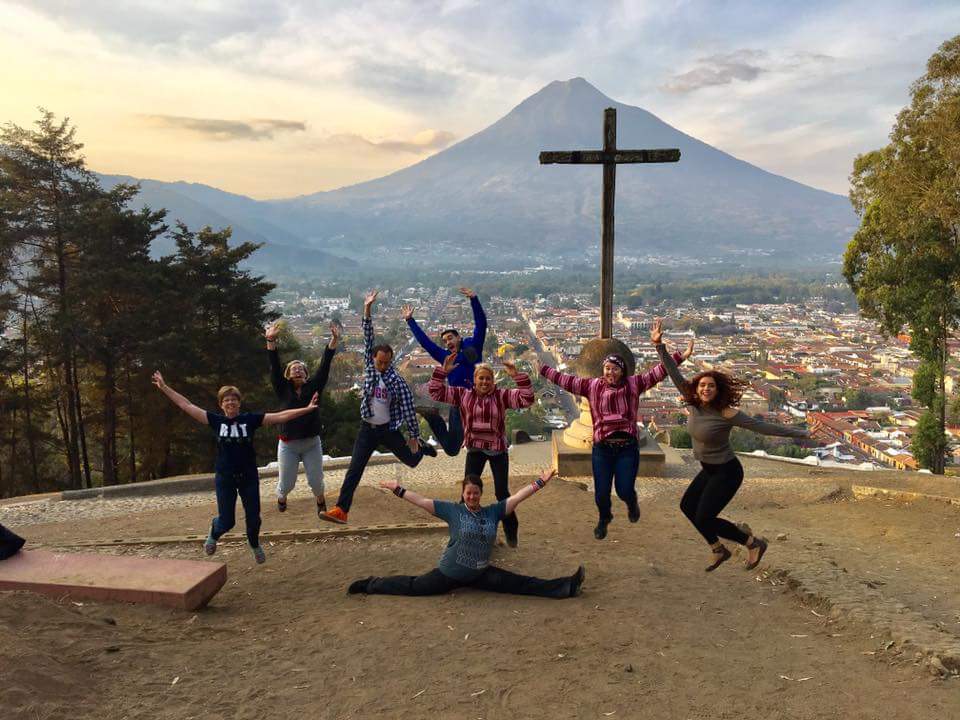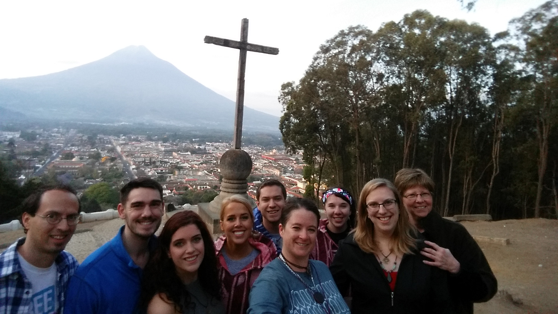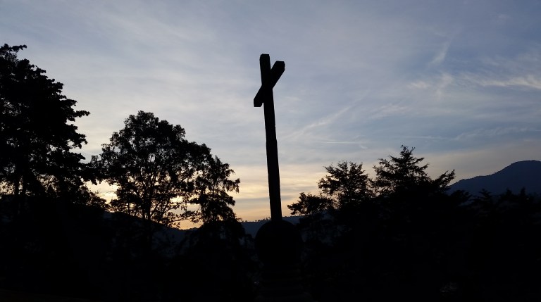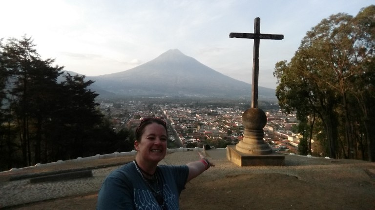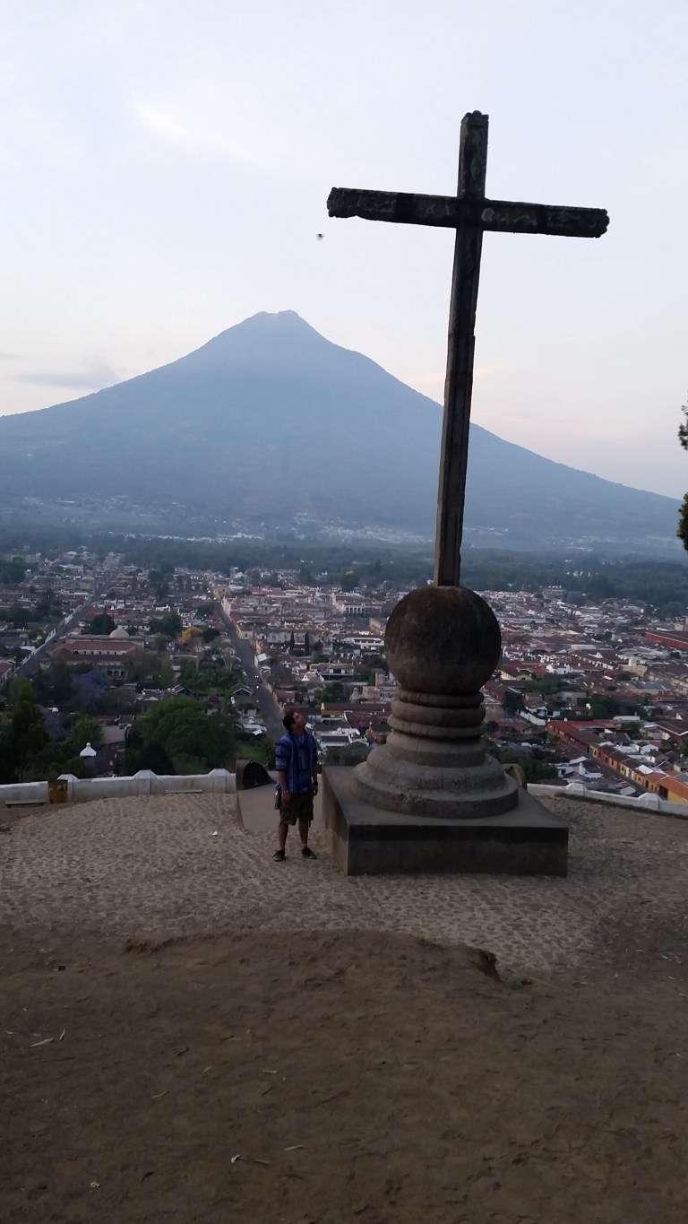 The cross at the top of the lookout overlooking Antigua and the volcano.