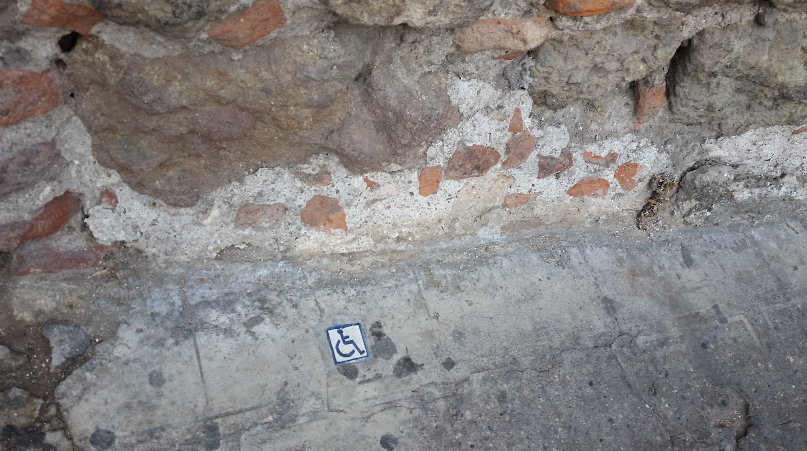 Look out for these tiny tiles in the pavement to alert you to disabled access to buildings. Due to the design and age of the buildings, most are not easily accessible, so if disabled access is available (ramps, wider doorways, etc), these two-inch-squared plaques are out the front of the buildings.