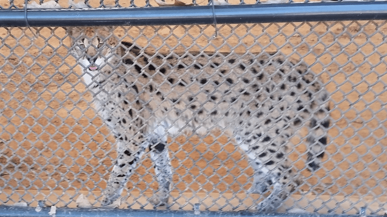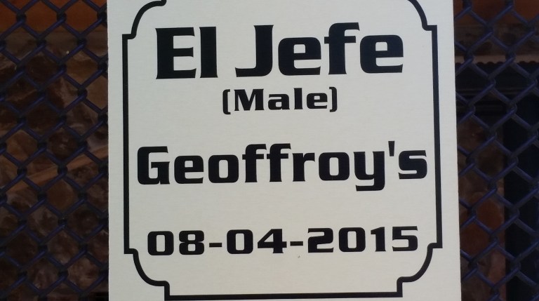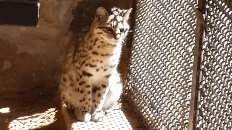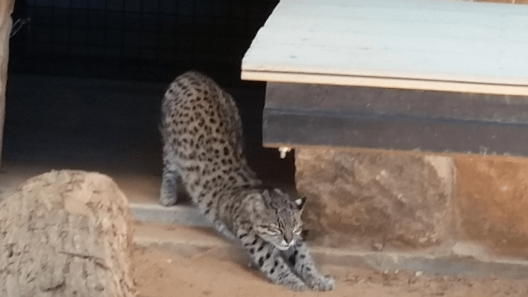 This is El Jefe, a Groffroy’s Cat, a wild cat native to South America. Similar in size to a domestic house cat with beautiful markings, much like a Bengal. El Jefe and his sister, Roraima, were rescued as kittens from a facility in Arkansas after their litter was born with no space to be housed.