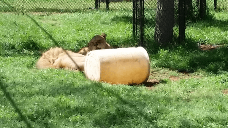 The saddest story of all… Pepe and Scrunches were rescued from Cancun, Mexico along with seven other African Lions. They had originally been with a breeder who used them for profit, then were given to a lady who completely neglected and malnourished them, keeping them in a concrete pen and feeding only chicken necks. They were bald from malnourishment and ring worm, and sadly several of the lions died from disease and underdevelopment. Due to malnutrition as a cub, Scrunches didn’t develop properly. She has trouble walking and is quite deformed, with the facial appearance of a bulldog rather than a lion, and an overbite which meant her top two canine teeth had to be removed to allow her to eat properly and stop them digging into her own jaw. She has regular pain medication to help her manage, although has been doing exceptionally well since arriving at Tiger Creek.
