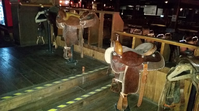 The famous mirror-ball saddle above the Honky Tonk dance floor. As featured in the movie starring Dolly Parton and Sylvester Stallone, “Rhinestone”.