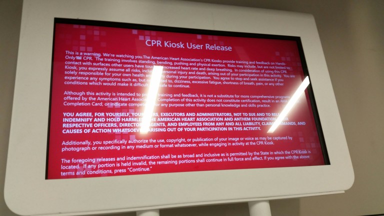 If you don’t want to learn CPR, you could just stand here and dance to the music (“Stayin’ Alive” by the BeeGees) and learn to dance with the movements on the screen…! 😉