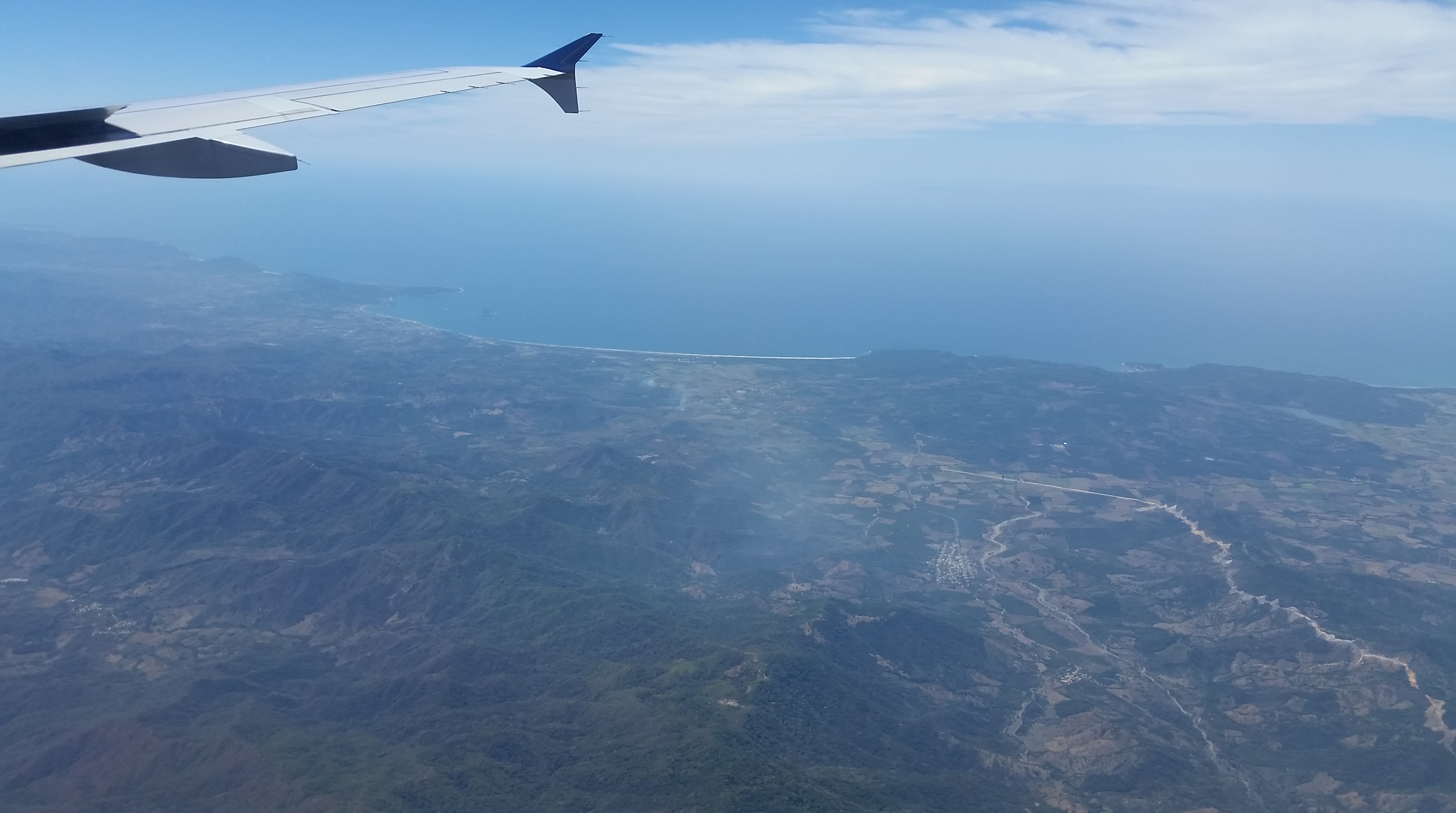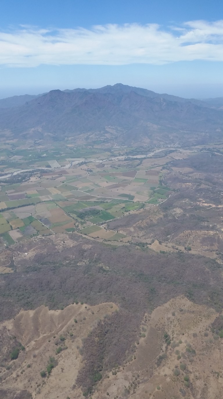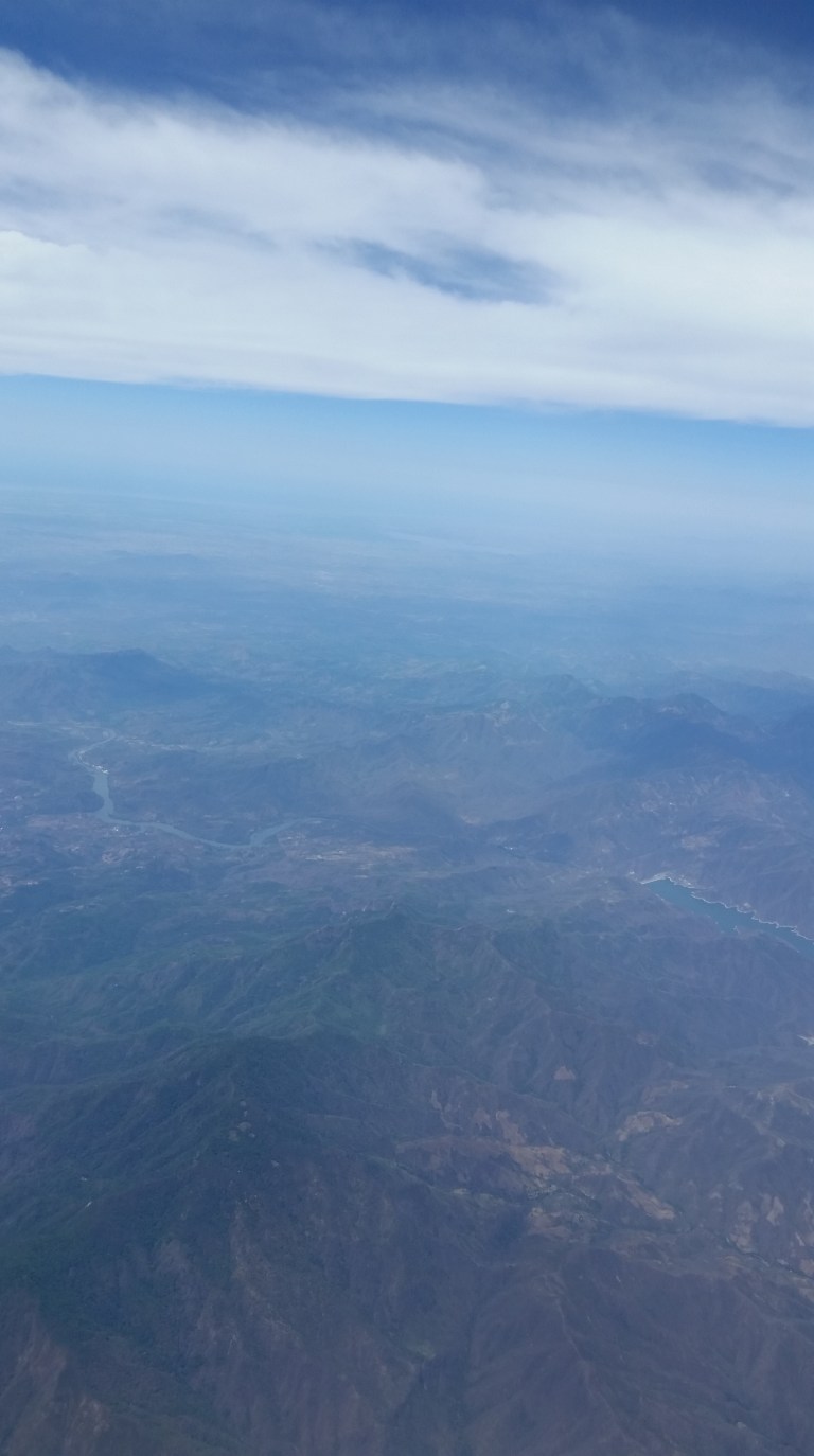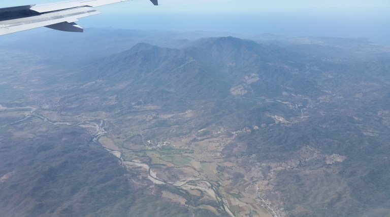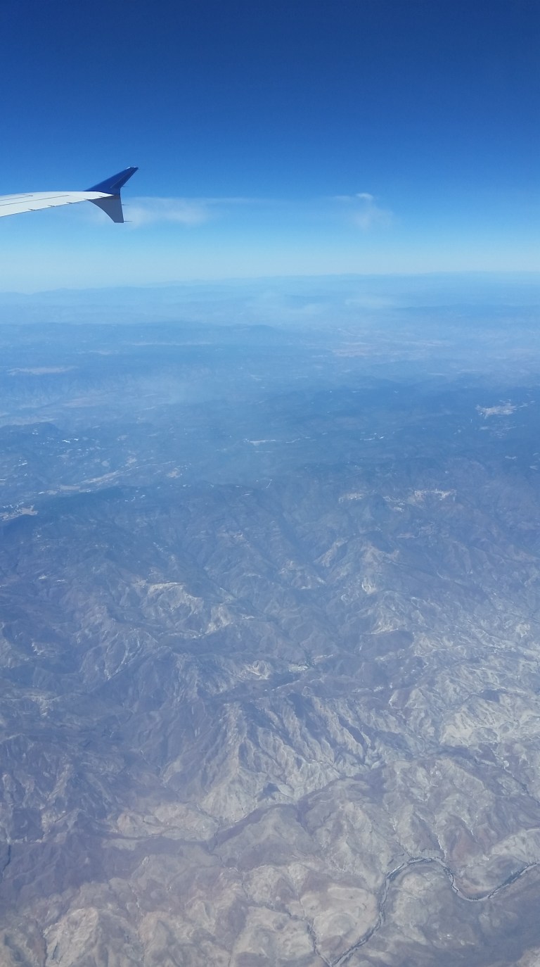 About 3 hrs into the flight, the clouds clear somewhat and the view is of canyons and mountains, the colours of the Mexican countryside.