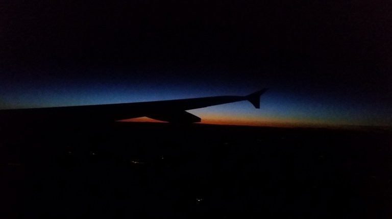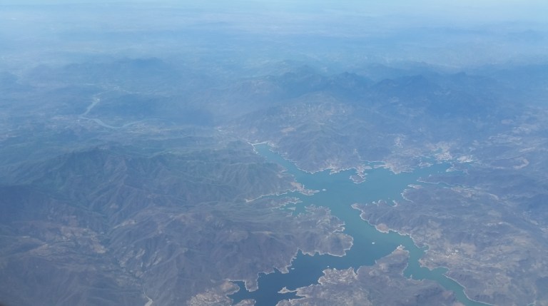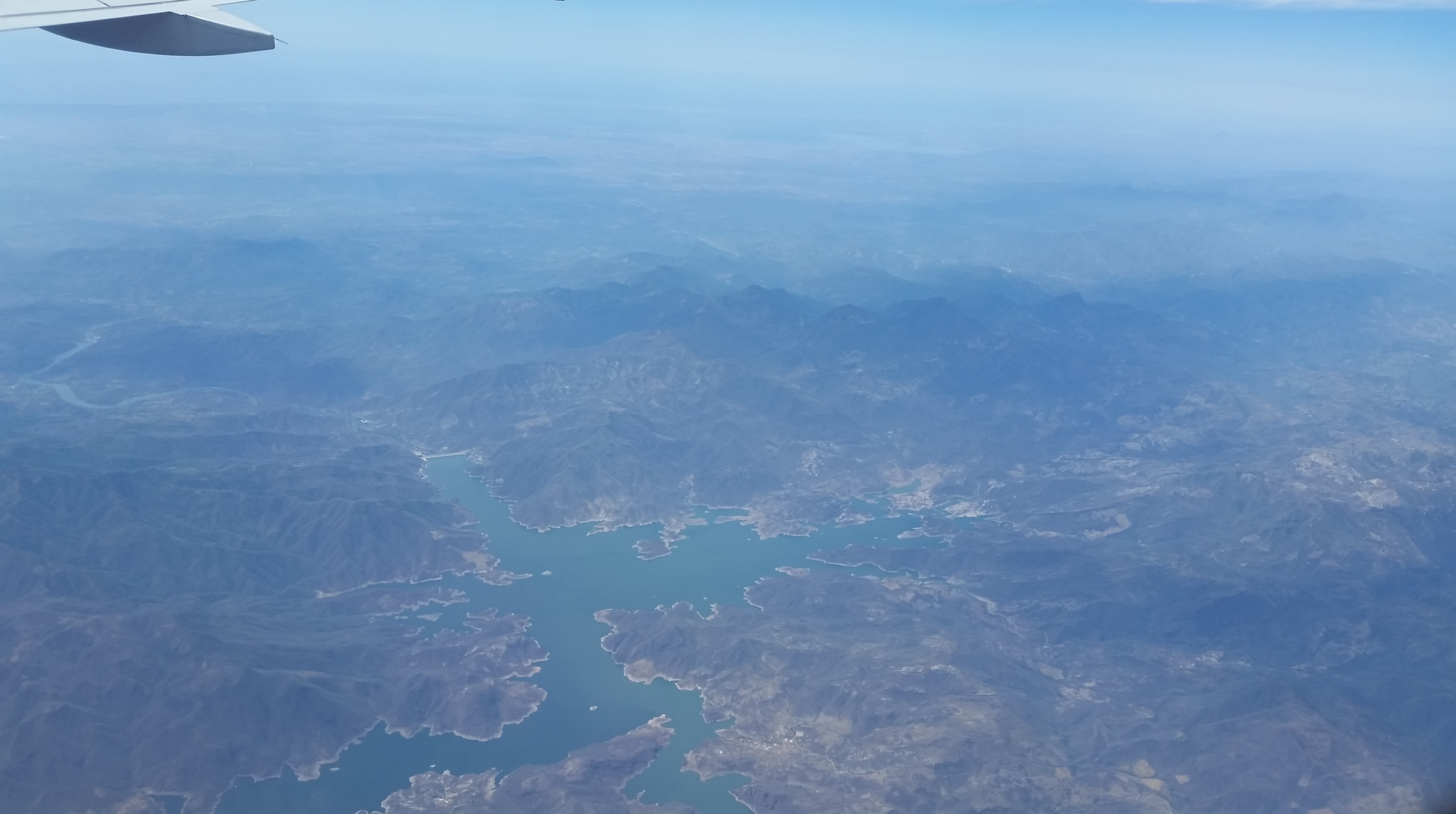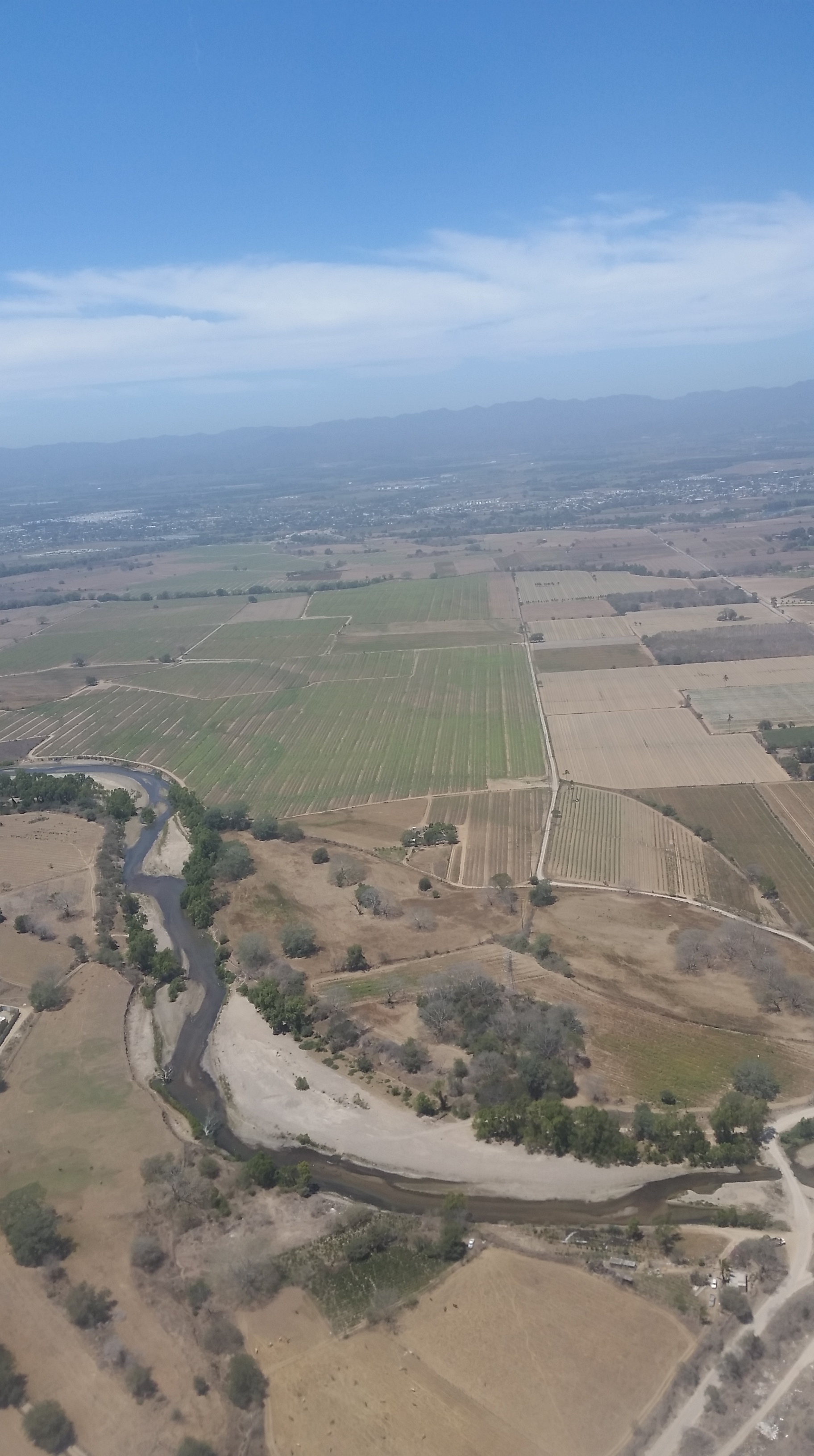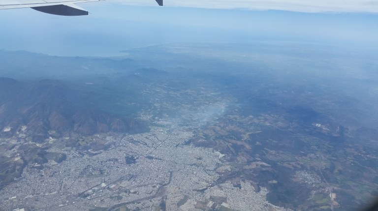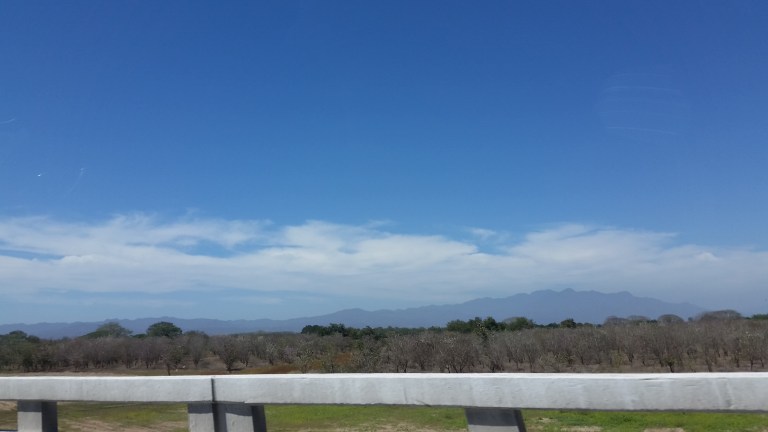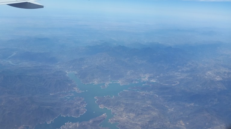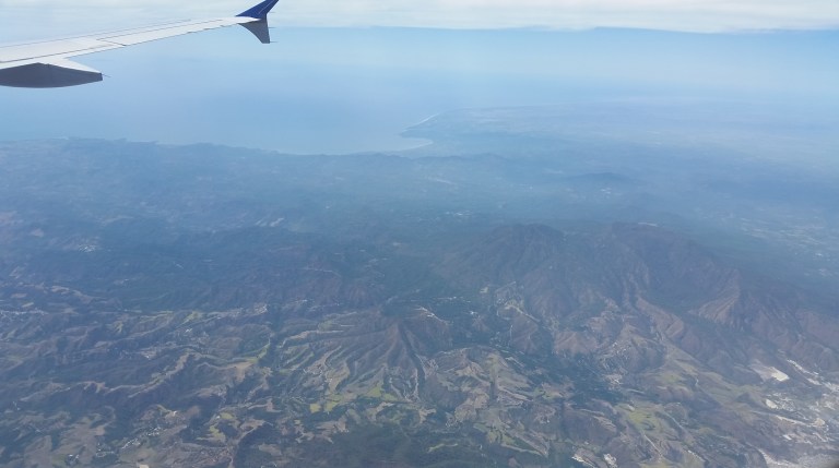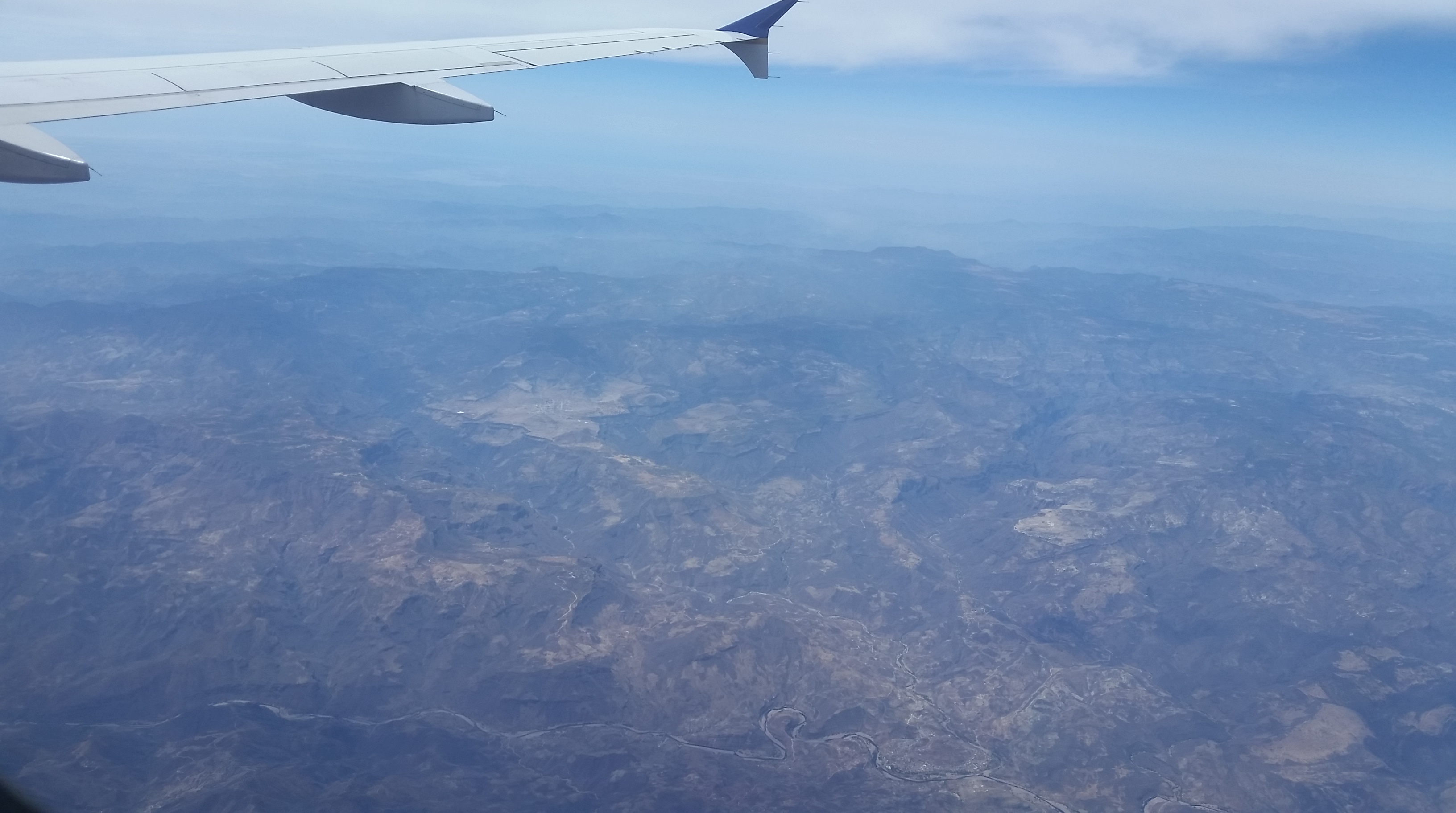 About 3 hrs into the flight, the clouds clear somewhat and the view is of canyons and mountains, the colours of the Mexican countryside.
