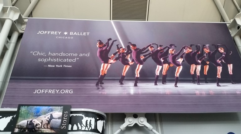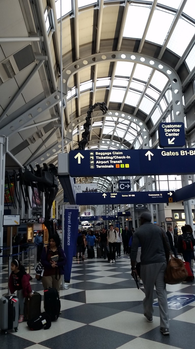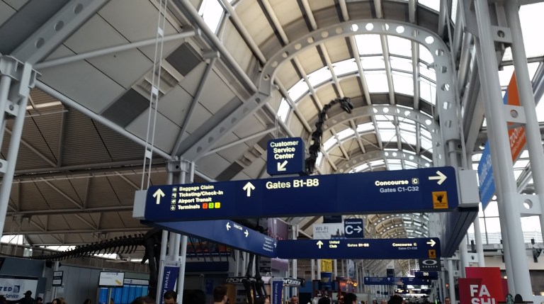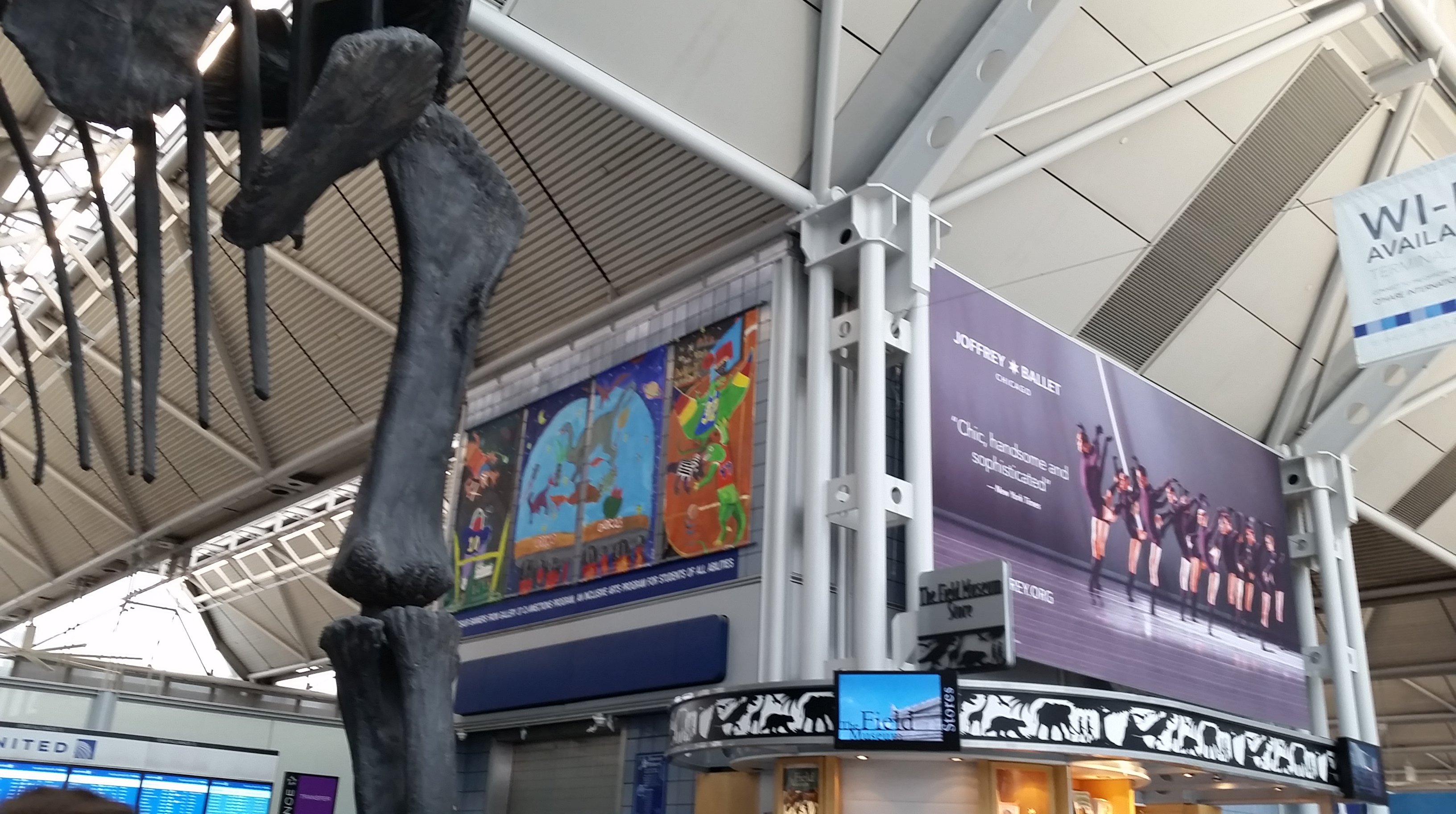 This Brachiosaurus altithorax is right there in the terminal, taking up a fair amount of room, as part of The Field Museum advertisement.
