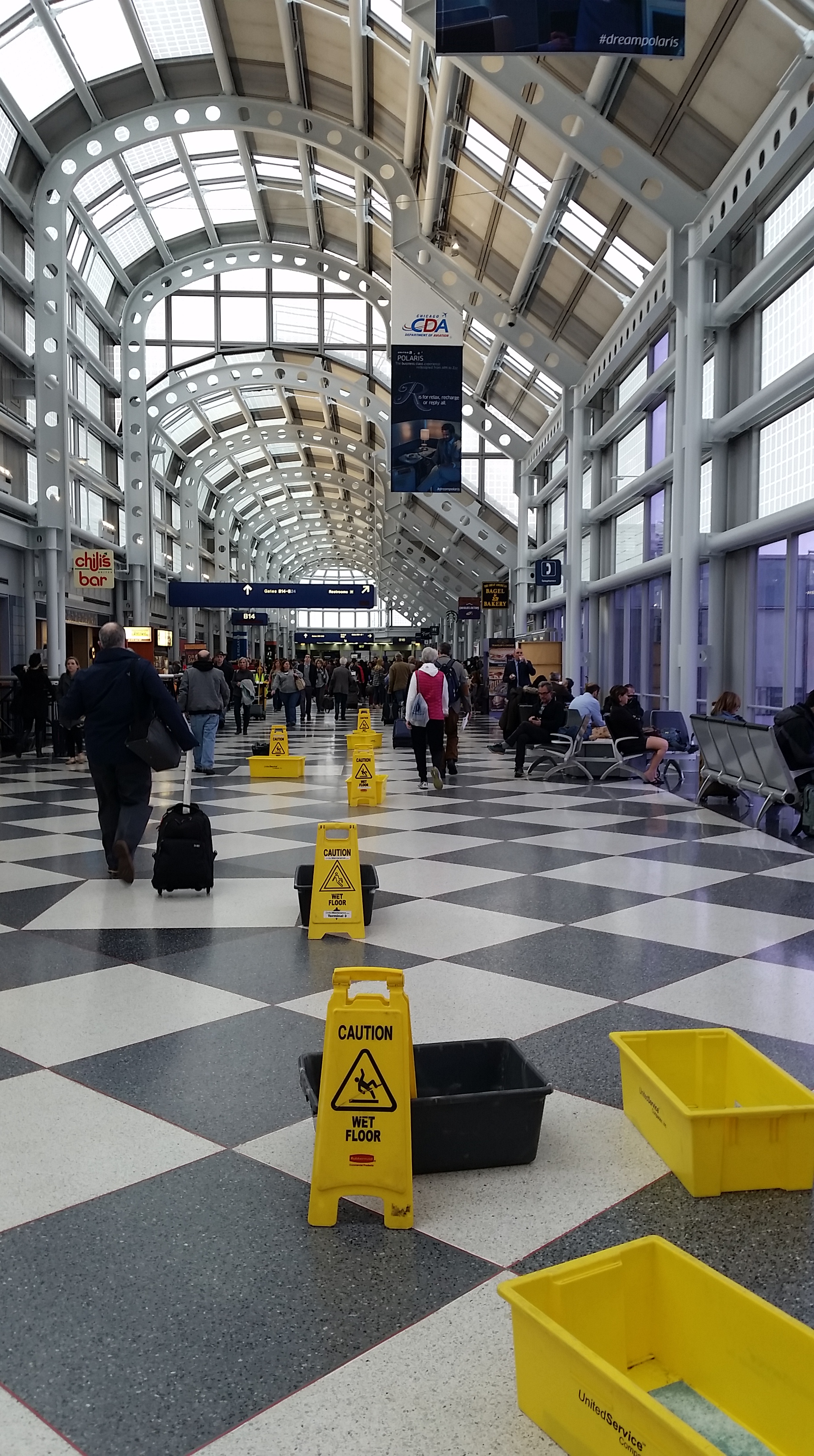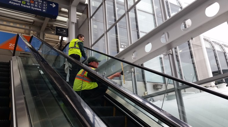 Heading back up to my terminal, couldn’t help but laugh at these two workers cleaning the escalator windows by taking a ride… the first one does the cleaning just holding the mop on the window, the second one comes two steps behind and just squeegees up the water – no lifting of tools required, simply ride the escalator and it does it by itself!